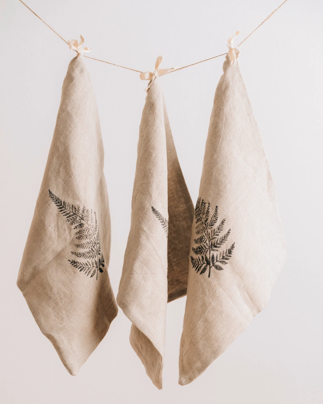 ? Ungefärbtes Naturleinen mit schwarzem Farnblatt-Aufdruck.