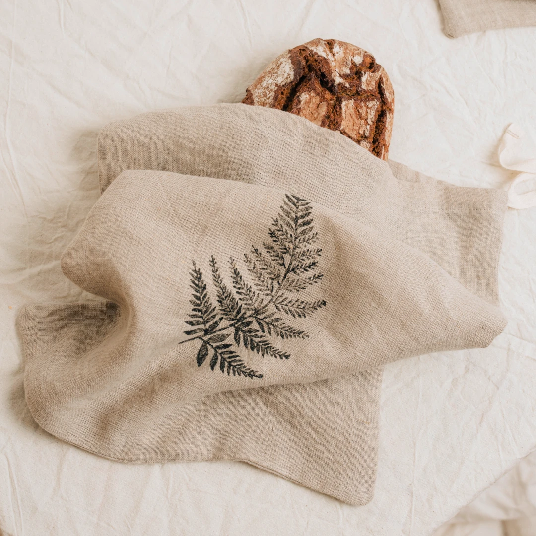 Brotbeutel aus Leinen zur Aufbewahrung von Brot & Gebäck, mit praktischem Zugband, von Hand bedruckt.