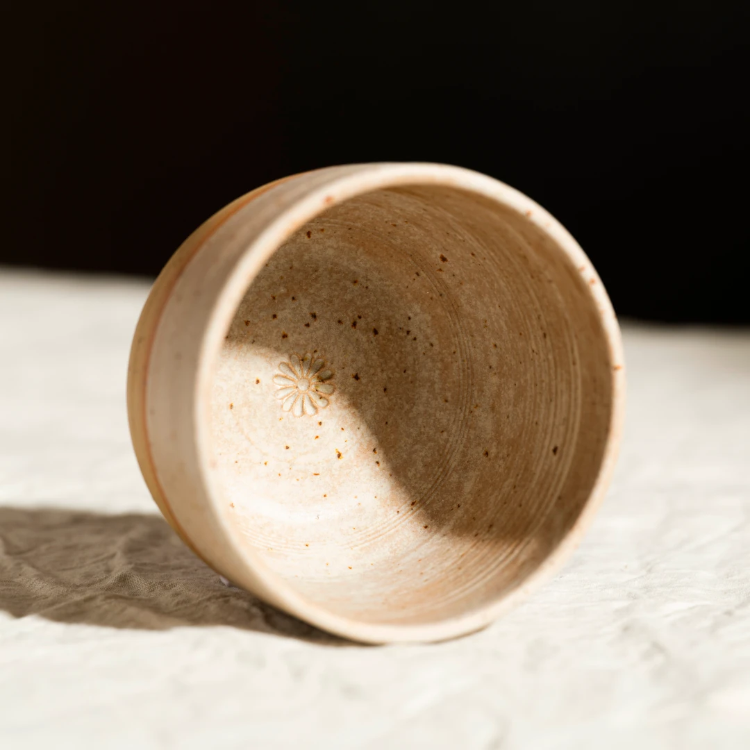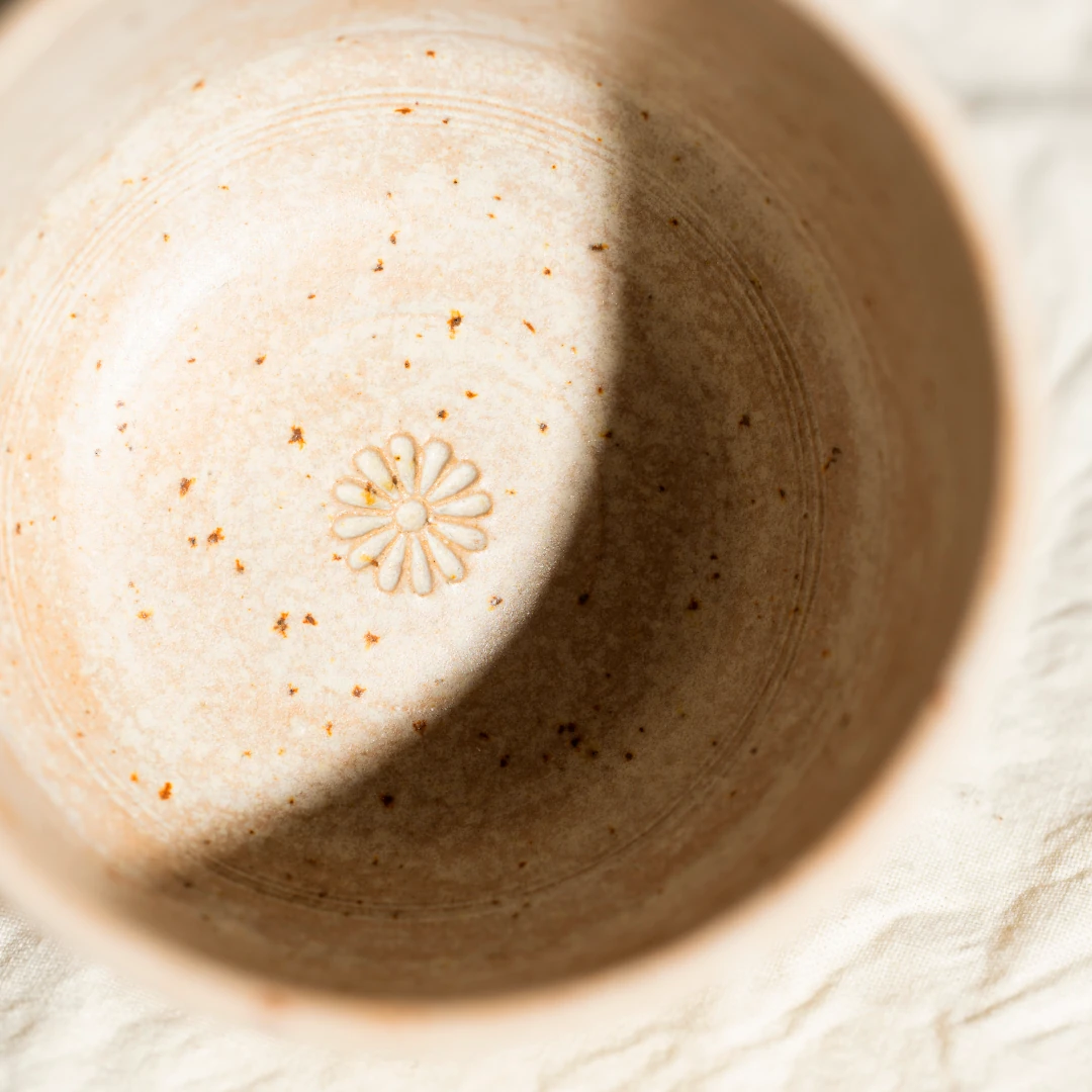 ? Die Grundfarbe des Bechers ist unglasiertes, beiges Steingut mit dunkleren Sprenkeln, die beim Brennvorgang entstehen. Am oberen Rand befindet sich ein zart-weiße Glasur, am Boden innen Blüten-Prägung.