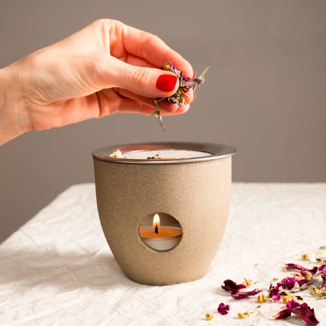 Wir lieben für diese Räuchermischung ganz besonders die Anwendung auf dem Stövchen. Lege dafür die Räuchermischung nur am äußeren Rand des Siebes auf, damit die Blüten und Kräuter sich erwärmen, aber nicht verbrennen. So entfaltet sich ihr zart-harmonischer Duft ideal.